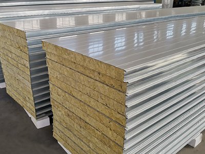 巖棉彩鋼夾芯板其上下表面采用鍍鋅彩色鋼板或鍍鋁鋅彩色鋼板,厚度為0.4-0.8mm。通過自動化連續(xù)成型機(jī),經(jīng)壓型后用高強(qiáng)粘合劑粘合而成。巖棉塊交錯鋪設(shè),其纖維走向垂直于巖棉彩鋼夾芯板的上下表面,并緊密相接充實(shí)了巖棉彩鋼瓦的整個縱橫截面。巖棉塊之間和域名與上、下層鋼板之間通過高強(qiáng)度發(fā)泡劑粘接復(fù)合而成。巖棉彩鋼瓦有很強(qiáng)的剛度,具有防火、保溫、隔音等性能。